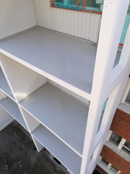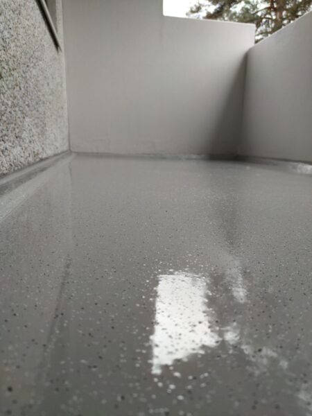 Parvekkeiden pinta on käsitelty EP 1 Erikoisepoksilla, jonka päälle on ripoteltu mosaiikkihiutaleita.